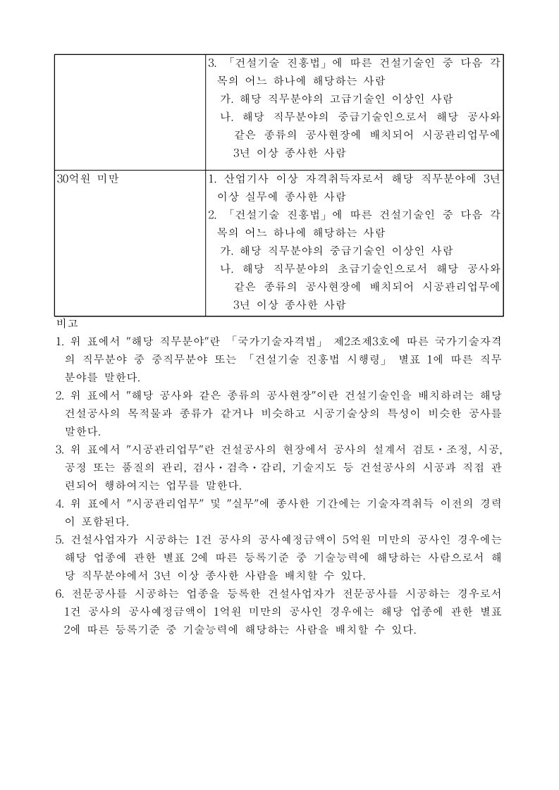 품질 / 안전 / 환경 등 분야별 기술자 배치 요건은 공사 내용에 따라 별도로 적용됩니다.