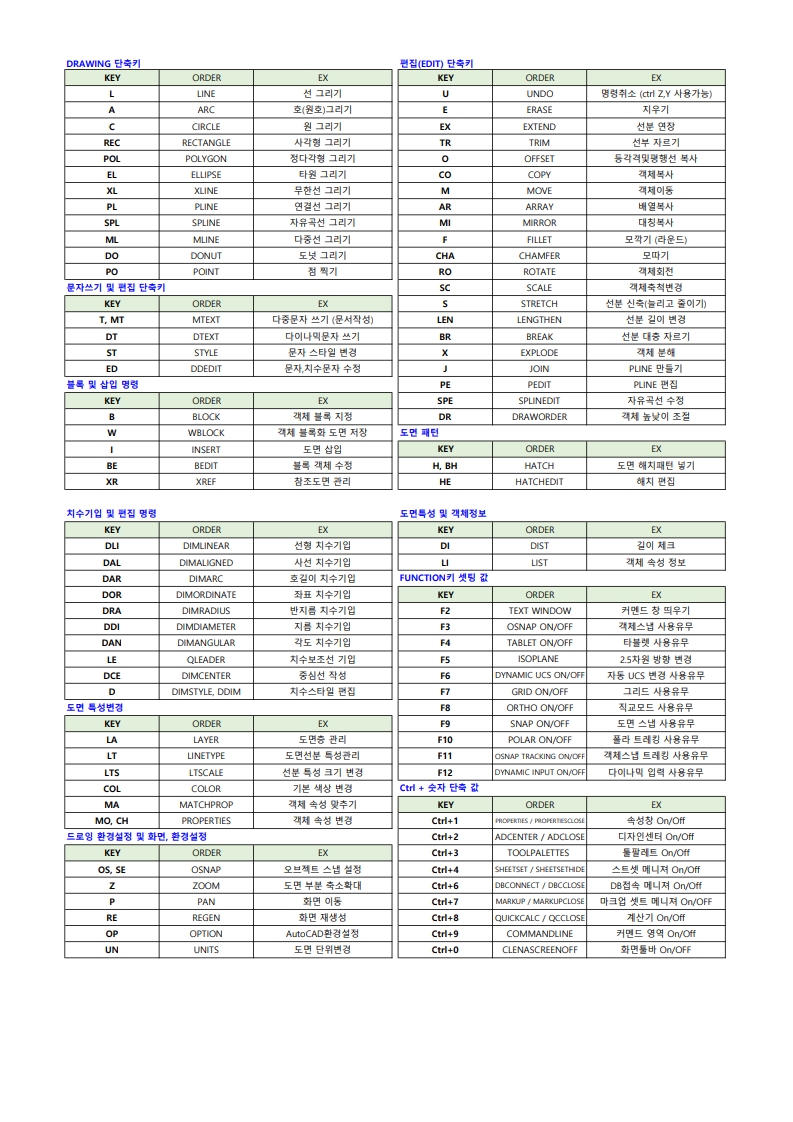 단축키만 잘 활용해도 도면 작어비 시간이 정말 눈에 띄게 줄어 듭니다. 게다가 손이 자연스럽게 익숙해지면 마우스보다 훨씬 빠르고 효울적으로 작업할 수 있어요.