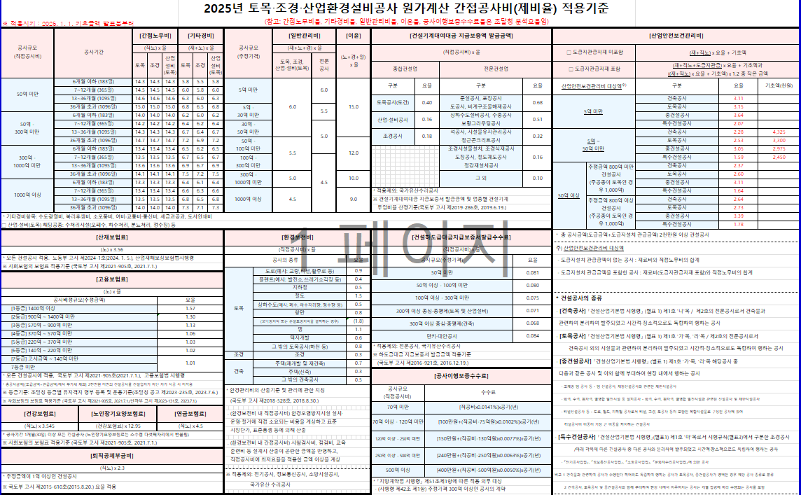 조달청은 매년 시설공사 원가계산 시 적용되는 간접공사비, 즉 제비율의 적용기준을 발표하여 공사비 산정의 투명성과 정확성을 높이고 있습니다. 2025년 원가계산을 위한 간접공사비 제비율표가 수정되었습니다. 발주 시 2025년 1월 1일 기준으로 기초금액이 적용이 되는 내용입니다. 이번 포스팅에서는 2025년 원가 계산 간접공사비 제비율표에서 변경되는 부분을 알아보고 제비율표를 공유하는 내용으로 준비해 보았습니다.