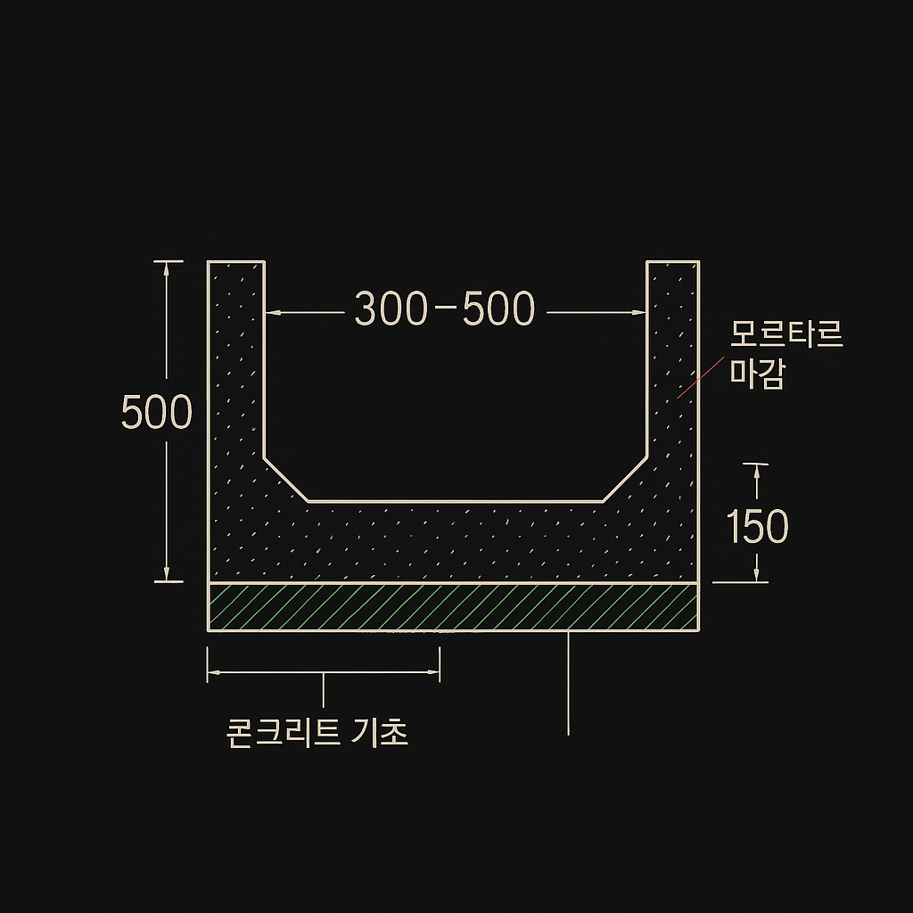 - 배수 경사 확보 : 최소 0.5% 이상 종단경사를 확보해야 함
