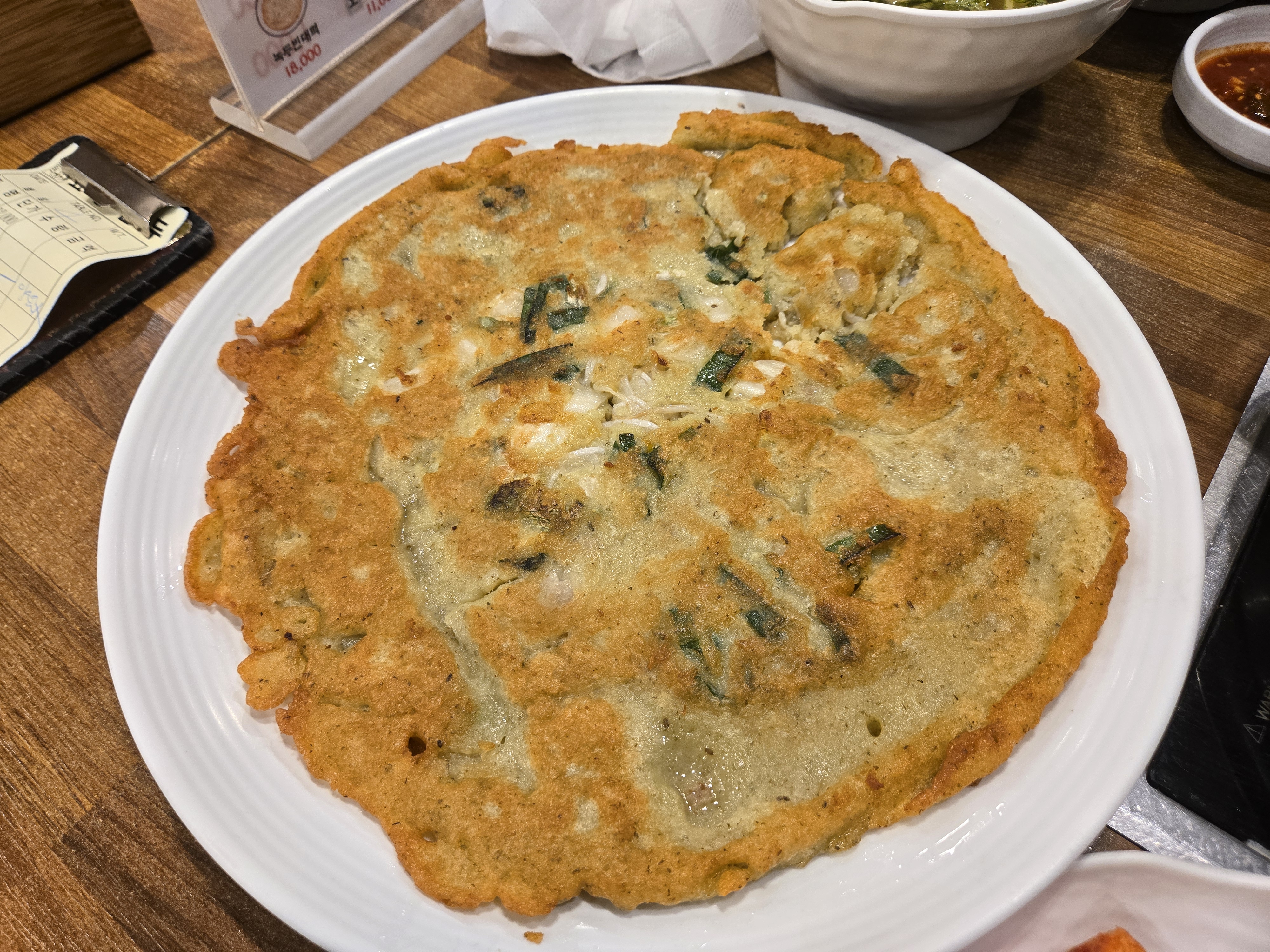 묘향만두의 대표 사이드 메뉴 녹두빈대떡입니다. 바삭한 겉면과 부드러운 속살이 조화를 이루며, 술안주나 식사 메뉴로도 좋을 듯합니다.