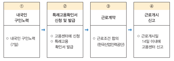 내국인 구인 노력에도 채용 못 할 경우 사업장 소재지 관할 고용센터에 특례고용 가능확인서 신청이 가능하며 신청일로부터 7일 내 발급됩니다. 확인서의 유효 기간은 3년입니다.