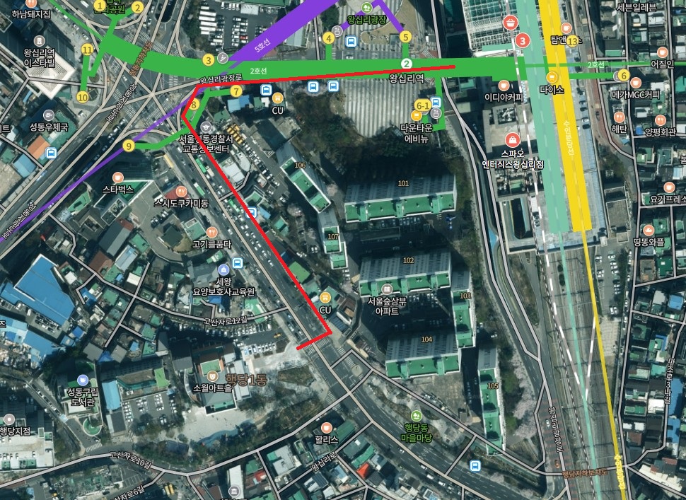 주차를 하고 엘리베이터를 이용해서 1층으로 이동해서 건물 밖으로 나와 제가 표시한 빨간색 라인 경로로 이동하면 6살 아이 걸음으로 10~11분 정도 걸리더군요. 이 경로로 이동하면 길도 거의 평지 수준으로 아이들도 걸어서 쉽게 이동할 수 있습니다.