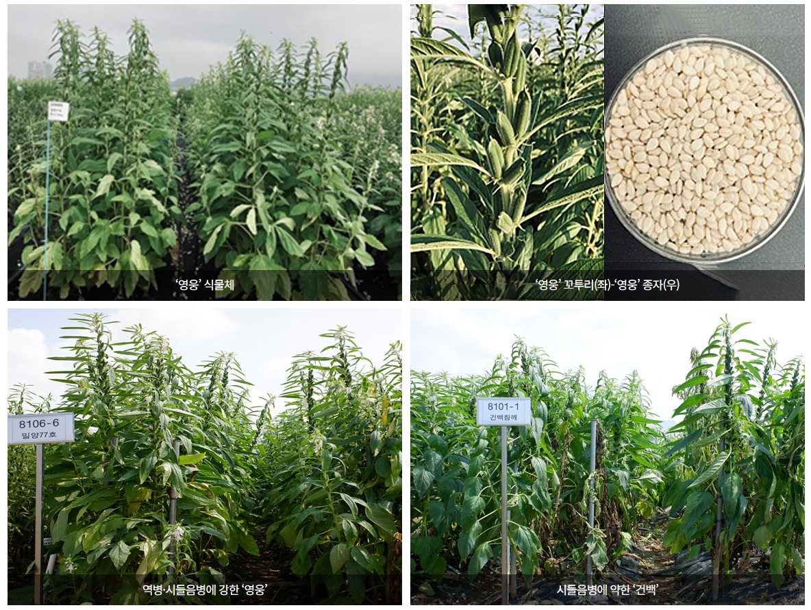 '영웅’ 수확량은 10아르(a)당 158kg으로, 지금까지 개발된 참깨 품종 중에서 가장 많다고 합니다. 기존 품종 ‘건백’보다도 28% 많은 양이라고 하네요.