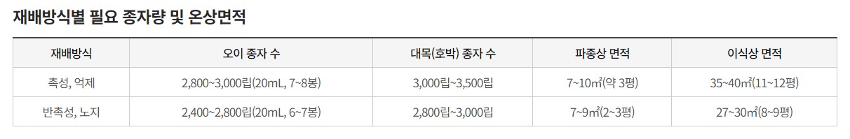 - 파종상 면적은 본밭면적 10a당 기준으로 대목용 파종상을 포함하여 촉성재배는 7~10㎡, 반촉성은 7~9㎡가 필요하고, 이식상은 이보다 3~4배 넓게 필요합니다.