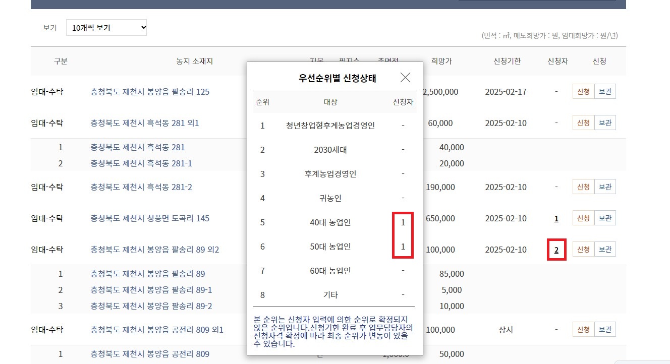 위 사진에서 처럼 신청자가 여러명일 경우에 1순위 청년 창업형 후계농업경영인, 2순위 2030세대, 3순위 후계농업경영인, 4순위 귀농인 신청자가 없고 5순위 일반농업인 중 40대 농업인과 50대 농업인이 신청한 걸로 보이는데 이럴 경우 특별한 결격 사유가 없으면 40대 농업인이 계약을 할 수 있어요.