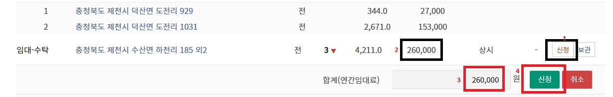 임대를 원하는 농지가 있으면 위에 사진에 번호순으로 입력을 하고 신청을 하면 되는데요. 신청을 누르면 연간 임대료를 입력하는 란이 나옵니다. 여기에는 2번 희망가를 입력을 하주시면 되는데요. 농어촌공사에 질의 결과 여기에 더 높은 금액을 쓴다고 임대 계약 순위가 올라 가는 것이 아니라고 합니다. 임대 희망가를 연간 임대료란에 동일하게 입력해주면 되고 희망가와 같거나 희망가 보다 높게 쓴다고해도 위에서 알려드린 임대 우선순위가 우선하여 순위가 높은 신청자가 임대를 할 수있습니다.
