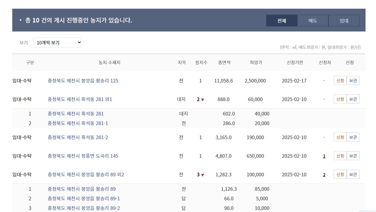 내가 거주하거나 영농 활동 할 곳을 정해 검색하면 농지 은행에서 가지고 있는 임대 매물을 볼 수가 있어요.