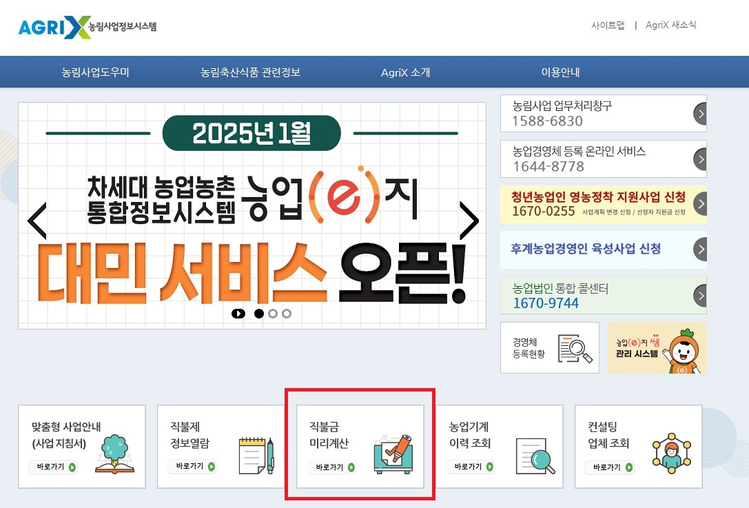 해당 사이트에 접속하면 메인화면 하단에 직불금 미리계산 바로가기 아이콘이 보이는데 아이콘을 클릭하시면 해당 페이지로 이동합니다.