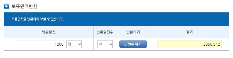 직불금 계산하기 페이지로 넘어가면 위에 사진 처럼 평을 제곱미터로 변환해 주거나 제곱미턴를 평으로 변환해 주는 것이 있어서 여기에 1200평을 넣어보니 3966.942 제곱미터로 바꾸어 나왔습니다.