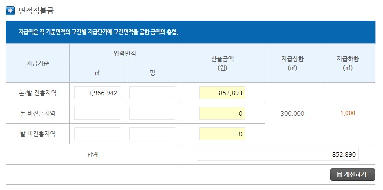 제곱미터로 바뀐 면적을 복사해서 화면 아래로 이동해보면 면적집불금 계산하는 곳이 나옵니다. 거기에 해당하는 행에다가 면적을 넣어주고 계산하기 버튼을 클릭해주면 산출금액이 나오며 이 금액이 대략 내가 받을 직불금액이 됩니다.
