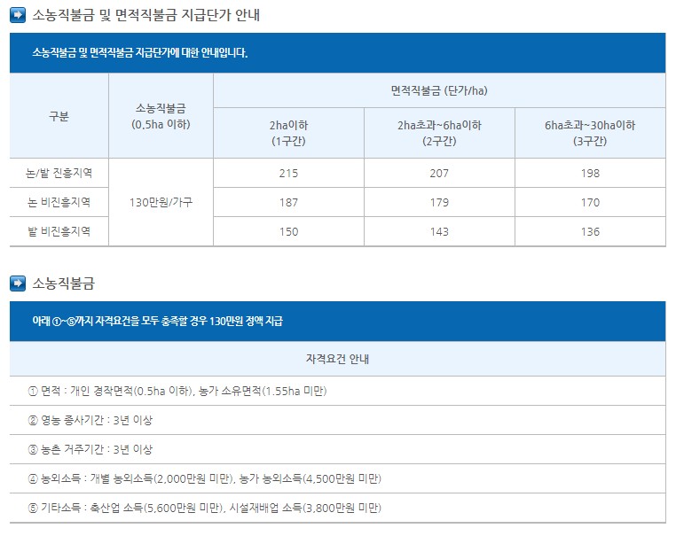 소농직불금은 위 표의 자격요건 1번에서 5번까지 모두 충족할 경우 130만원의 직불금을 정액 지급한다고 하네요.