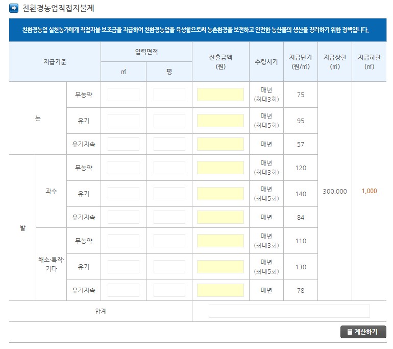 나의 직불금 계산하기는 사용자가 입력한 값을 토대로하여 계산되며, 실제 지금되는 직불금 금액과는 차이가 있을 수 있다고 안내하고 있어요. 단순 참고 자료로 이용하시면 좋을 듯 합니다.