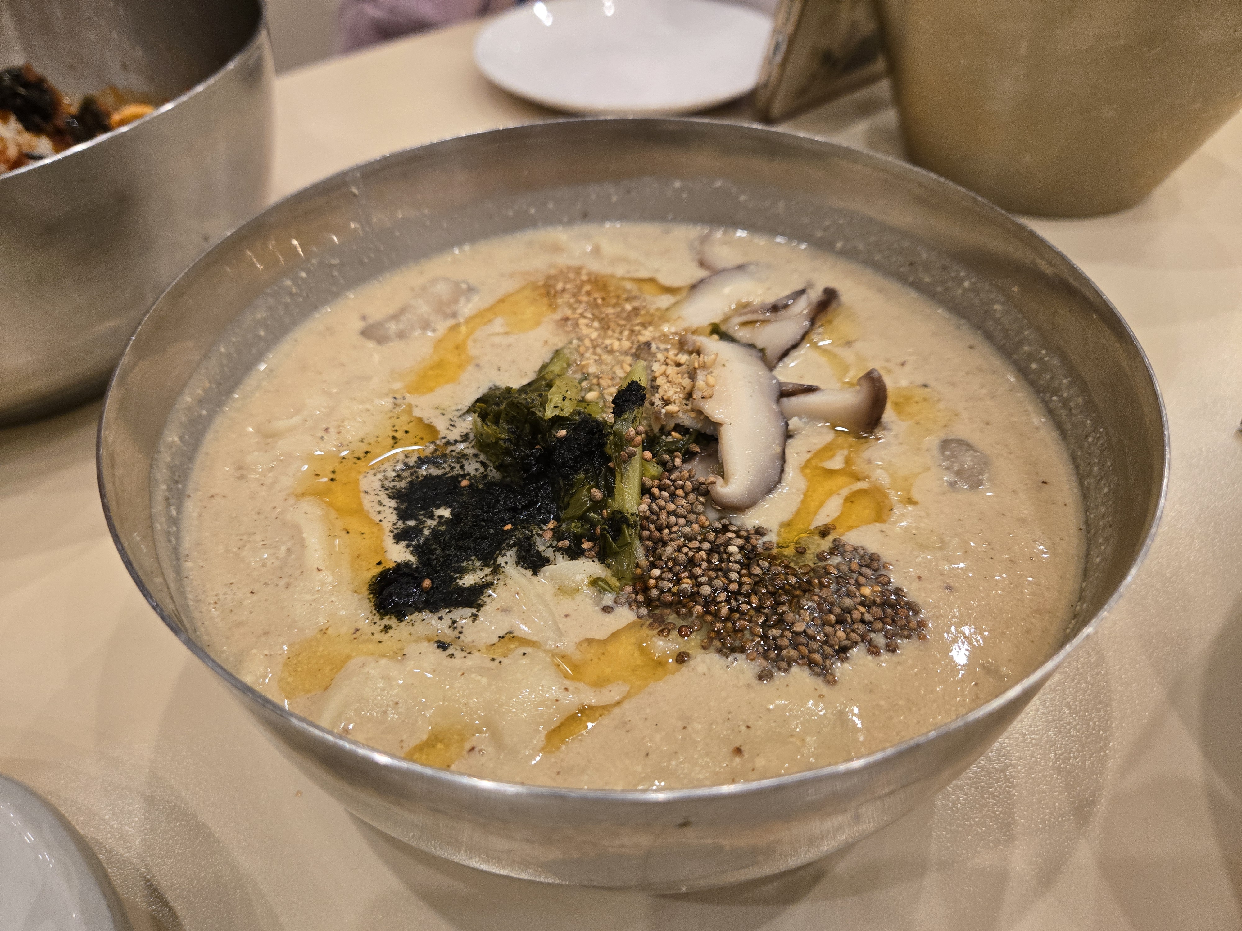 쫄깃한 옹심이와 고소한 들깨 국물이 환상적인 조화를 이루는 요리입니다. 추운 날씨에 먹으면 속까지 따뜻해지는 메뉴로 강력 추천합니다. 볶은 들깨와 버섯, 시래기가 고명으로 올라가 있었고 마지막으로 들기름을 둘러 비주얼적으로도 훌륭했습니다.