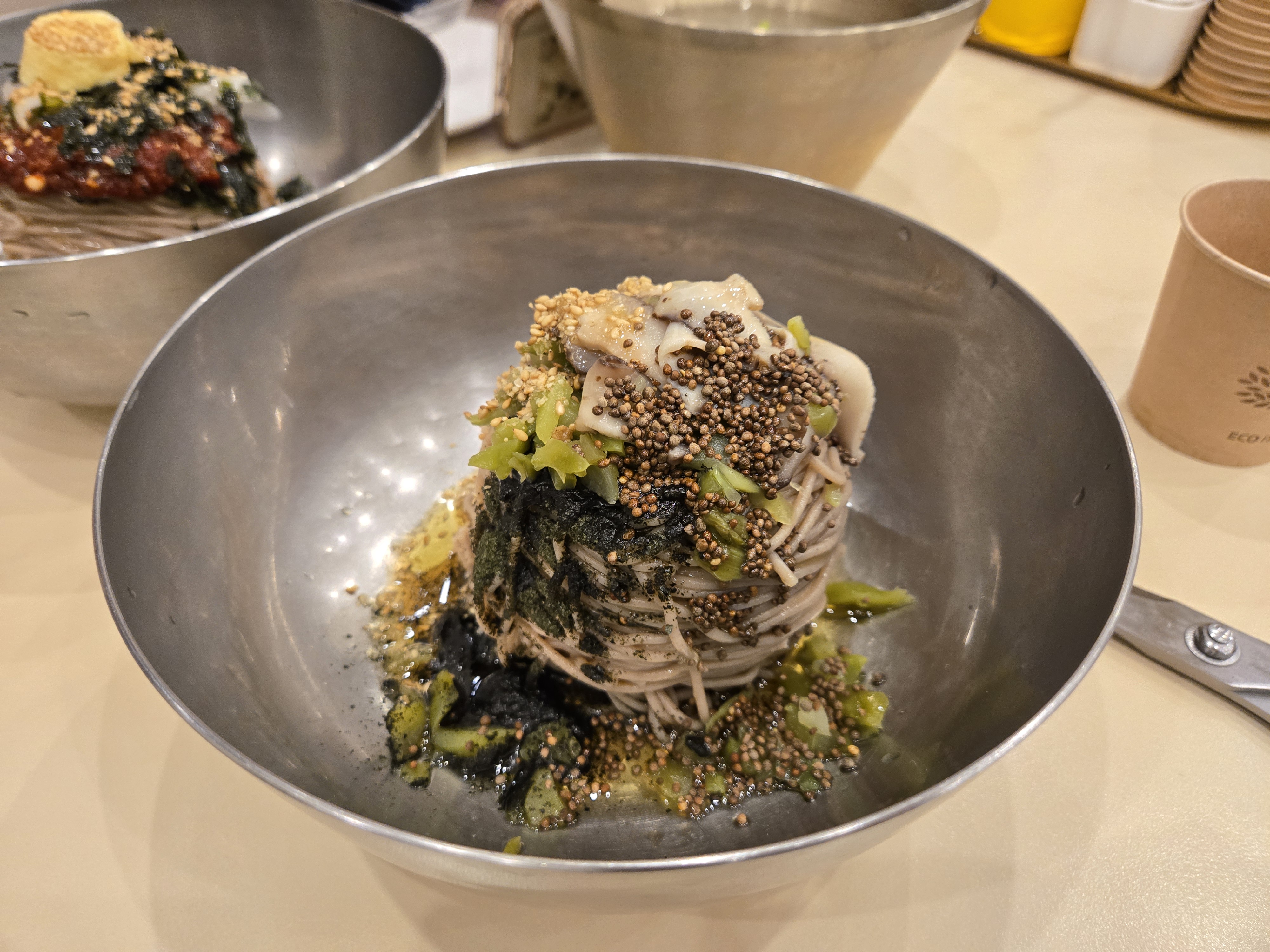 적당히 매콤한 양념이 더해져 입맛을 돋우는 메뉴입니다. 들기름 막국수와는 또 다른 매력을 느낄 수 있어요. MSG에 절여진 제 입맛에는 아주 약간 심심한 맛이였지만, 그로인해 메밀의 맛과 향을 더욱 즐길 수 있어서 오히려 좋았습니다. 성인 남성 기준 양은 적은 편입니다.