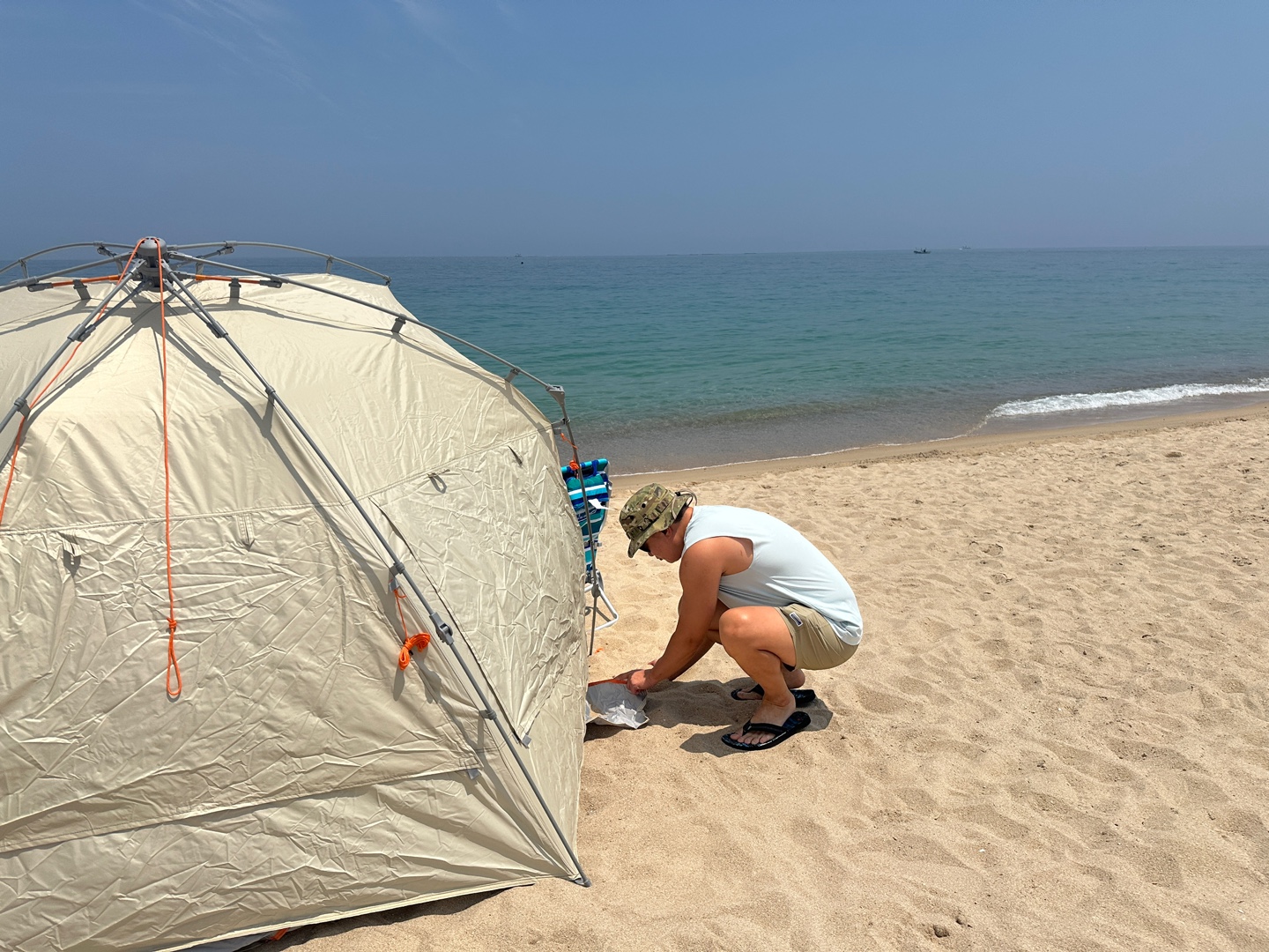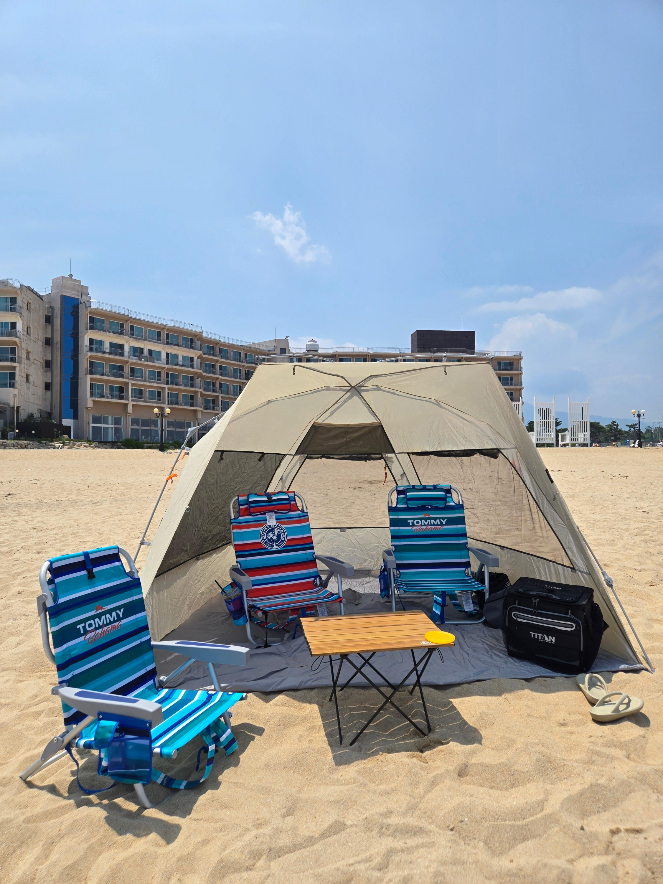 모래사장에서 텐트 치기? 예전 같았으면 벌써 땀 뻘뻘 흘렸을 일입니다.