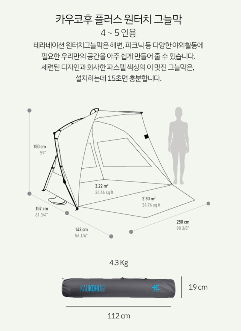 - 특징: 원터치 설치 시스템, UPF 50+ 자외선 차단, 메쉬 창, 프라이버시 커튼, 재활용 소재 사용