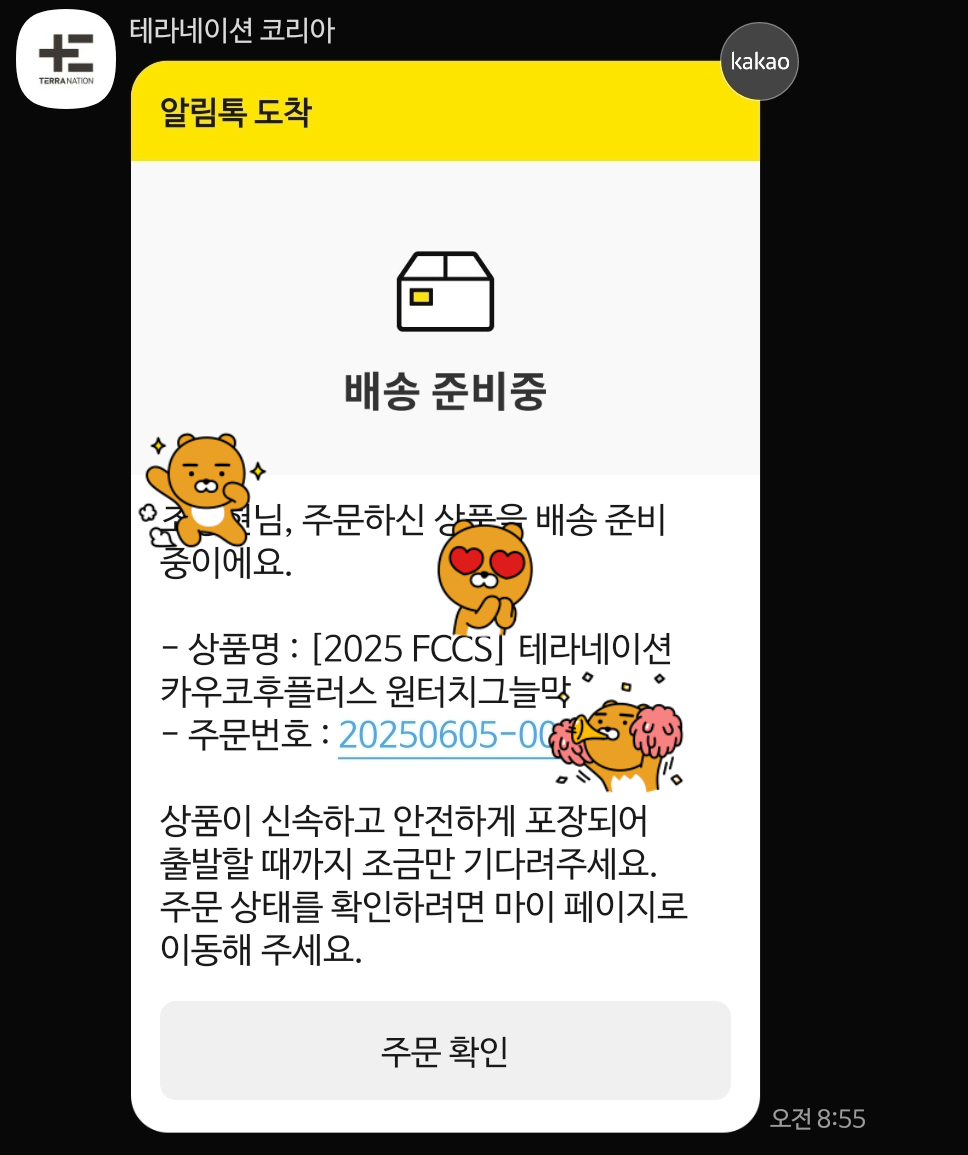 제품을 구입하면 배송 상황이 바뀔 때 마다 카톡을 보내줘서 별도로 사이트에 들어가서 알아봐야하는 번거로움이 없어서 좋았습니다.
